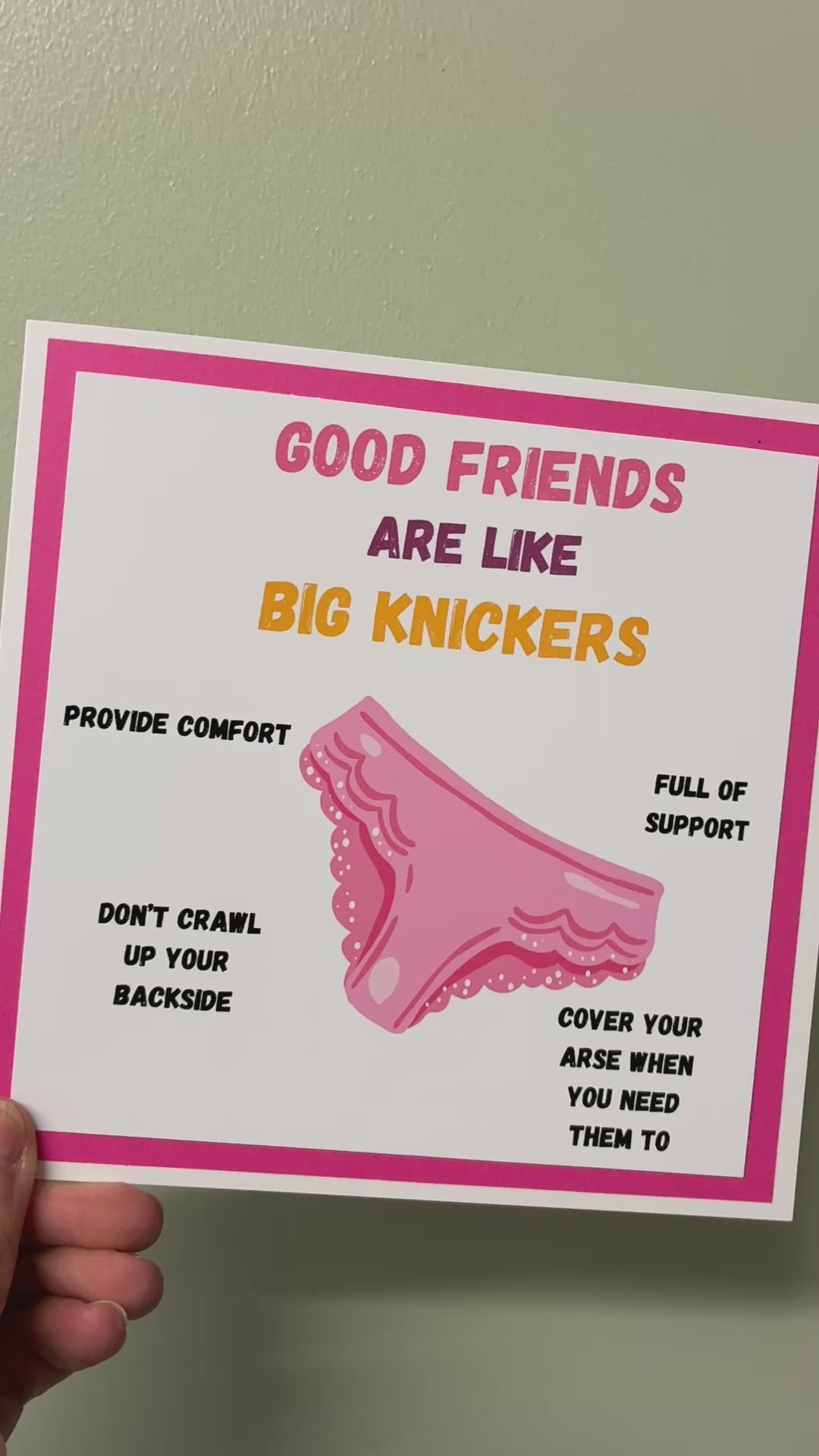 Looking for a bold, laugh-out-loud card for your bestie? This hilarious “Good Friends Are Like Big Knickers” card is the perfect cheeky way to celebrate your friendship!